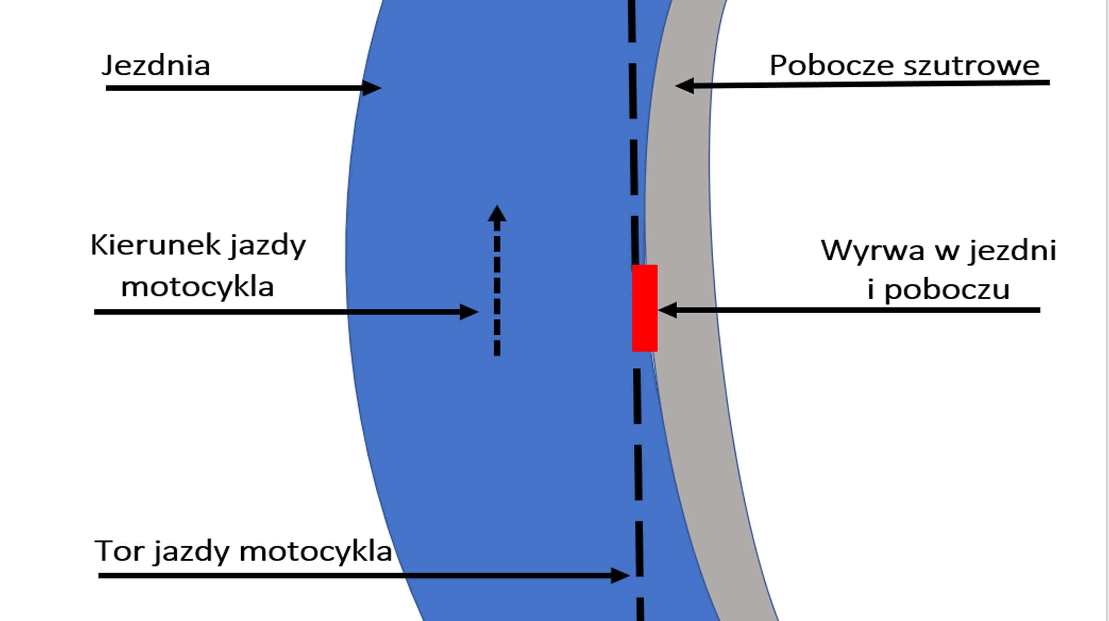 Na jednym z prawych zakrętów zbyt późno zobaczyłem głęboką i dość długą wyrwę w asfalcie jak i szutrowym poboczu. Uderzyłem kołem wózka o krawędź asfaltu. Koło uniosło się do góry i przejechałem kilka metrów na dwóch kołach. Lądowanie wózka było bardzo gwałtowne i tylko z wielkim trudem udało mi się utrzymać w miarę prosty kierunek jazdy, która zresztą została gwałtownie wyhamowana. Koło wózka zostało zablokowane i dalsza podróż była niemożliwa.