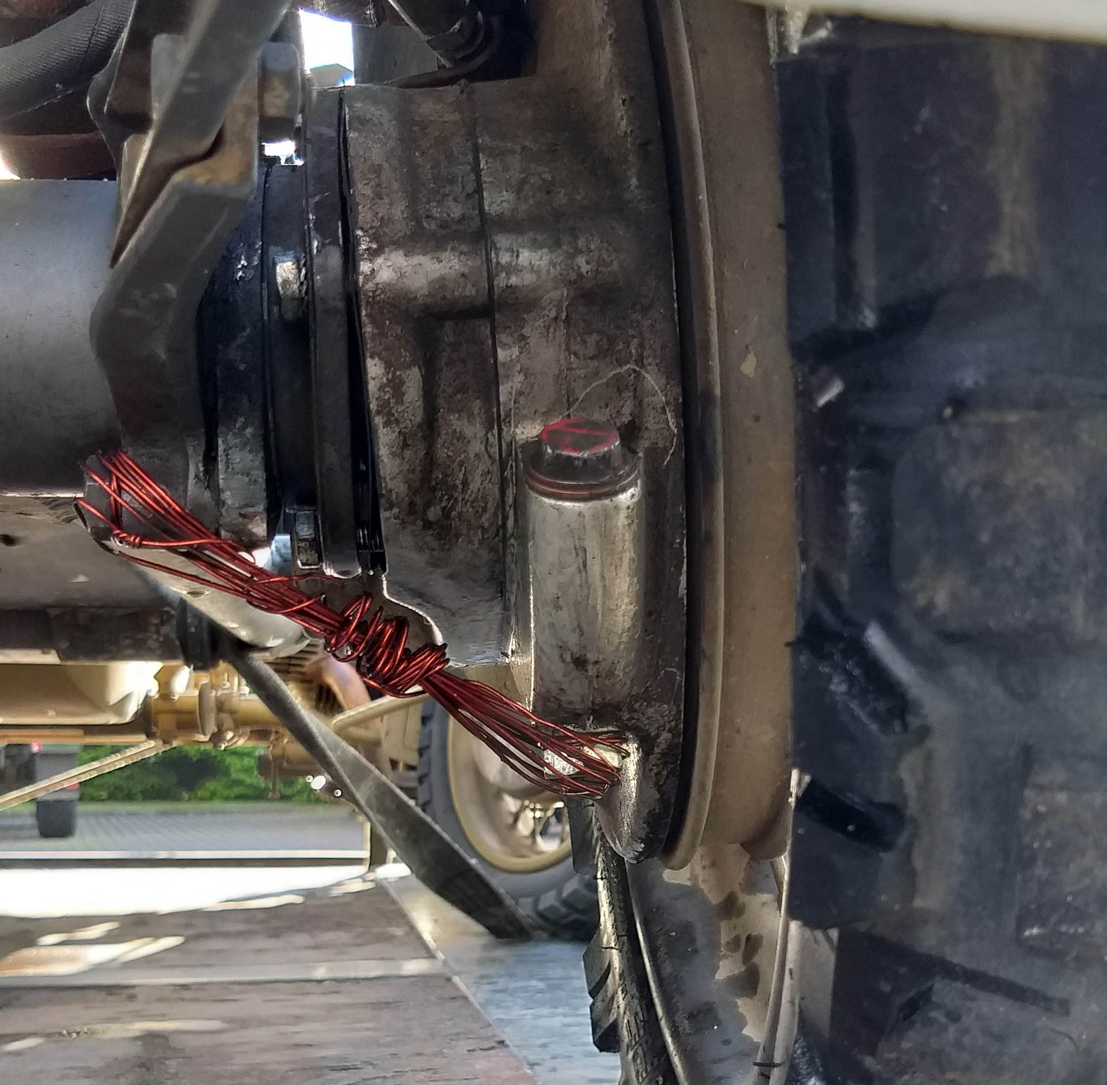 Okazało się, że na skutek uderzenia popękały śruby mocujące aluminiową obudowę zwolnicy do ramy wózka. Na pierwszy rzut oka zdawało się, że nie będzie możliwe przejechanie ani jednego metra. Jednakże po przybyciu, zaniepokojonego moją długą nieobecnością przyjaciela, Ryszarda Glena spróbowaliśmy dokonać prowizorycznej naprawy. Nie trzymające śruby zastąpiliśmy systemem drucianych i składających się z pasków skórzanymi mocowań.