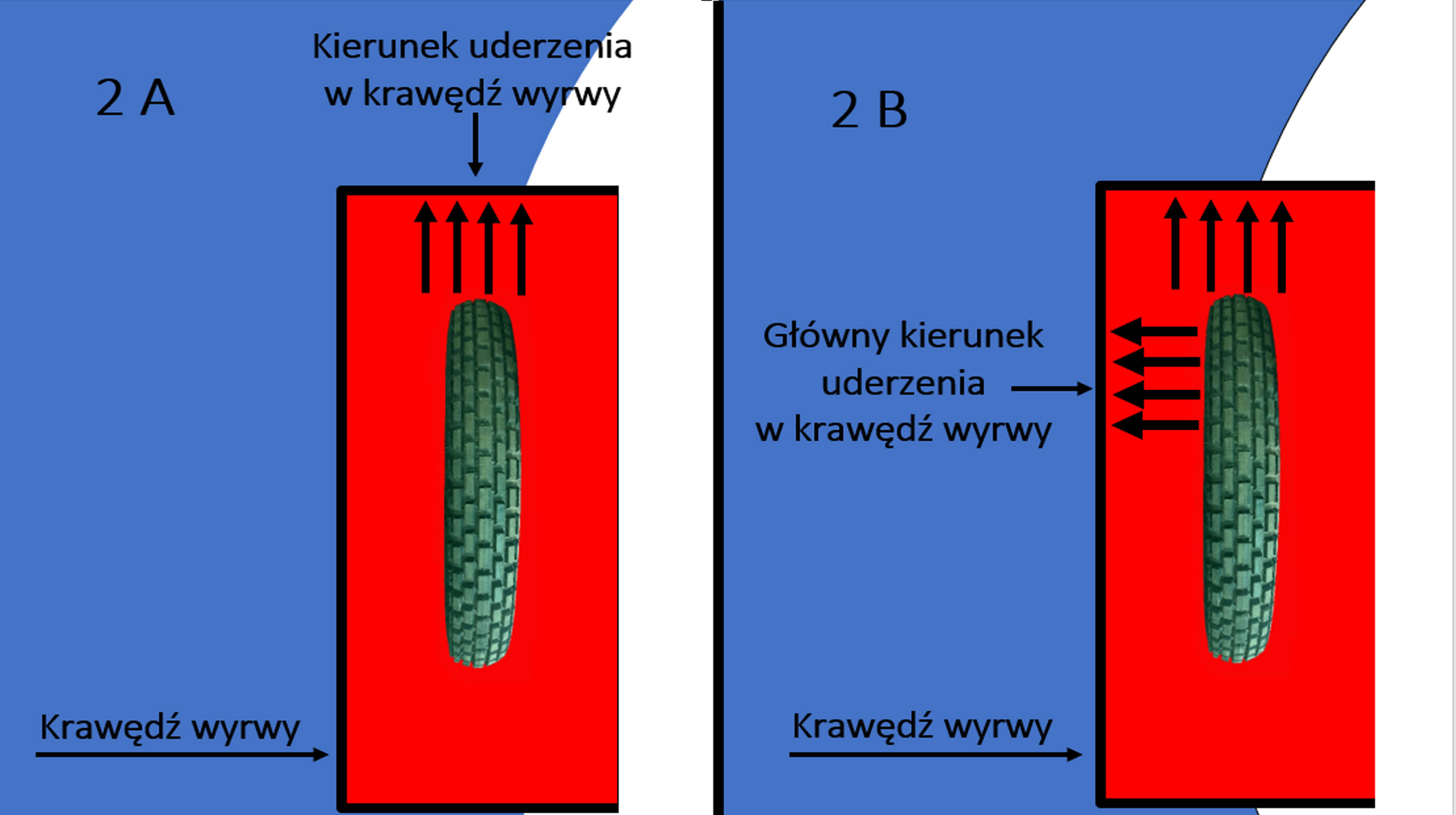 Długie zatarcie powierzchni bocznej felgi świadczy o tym, że główne uderzenie nie poszło na czoło opony lecz na bok koła. Schematycznie przedstawiam to na rysunku 2B. Przypuszczam, że w ostatniej chwili nie zachowałem tzw. zimnej krwi umożliwiającej kontynuowanie wybranego kierunku jazdy i skręcając w lewo spróbowałem ominąć dziurę.