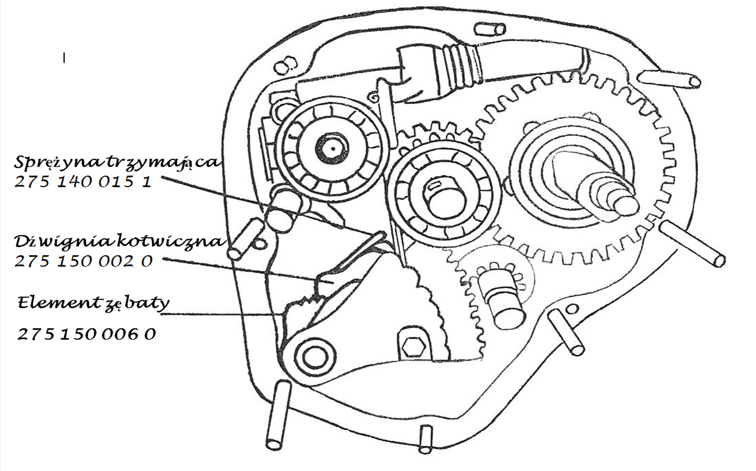 W motocyklach wykazujących taką wadę musi być wymieniona na ulepszoną dźwignia kotwiczna, część zamienna - nr 275 1 50 002 2, zmodyfikowany segment zębaty, część zamienna - nr 275 1 50 006 0 oraz wzmocniona sprężyna dociskową, część zamienna - nr 275 1 40 015 1 .