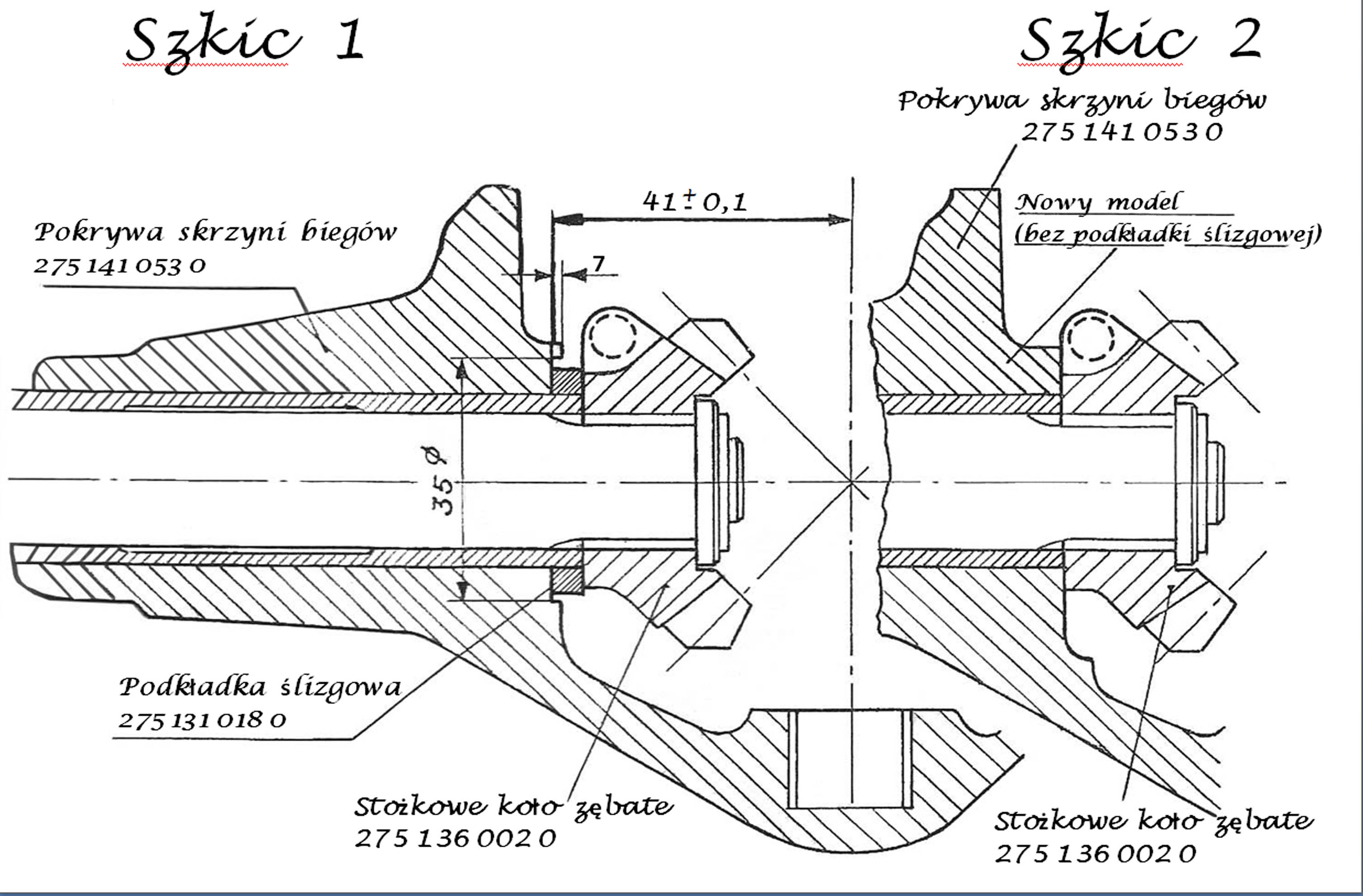 W przyszłości pokrywa skrzyni biegów będzie dostarczana w taki sposób, aby tuleja nie wystawała, a koło zębate stożkowe stykało się bezpośrednio z pokrywą skrzyni biegów i podkładka oporowa była niepotrzebna (patrz   szkic 2).