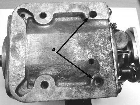 Rozbite otwory (A) osadcze. Zamontowany iskrownik będzie miał możliwość przemieszczenia się na trzpieniach osadczych wystających z korpusu silnika. Przesunięcie iskrownika do tyłu tylko o 1 mm będzie skutkowało słabszym dociskiem sprężyny (szczególnie w KS 750) na pokrywę uszczelniającą. To prowdzi w prosty sposób do wycieku oleju spod pokrywy.