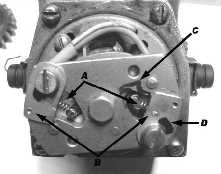 Także umieszczenie trzpieni (B) trzymających sprężynki na przyspieszczu jest nieprawidłowe. W widocznych blaszkach jeden trzpień powinien znajdować się w otworze bliższym osi przyspieszacza a drugi w otworze zewnętrznym, skrajnym.