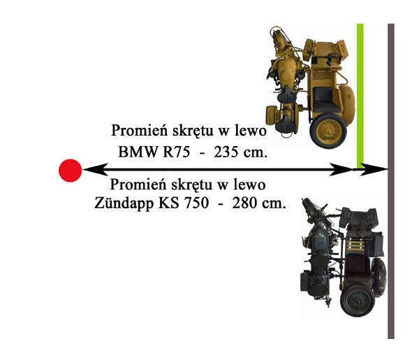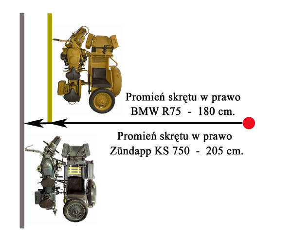Według fabrycznych danych skręcając w lewo BMW R75 zmieści się w okręgu o średnicy 470 cm (promień skrętu 235 cm) a Zündapp KS 750 będzie potrzebował do tego okręgu o średnicy 560 centymetrów (promień skrętu 280 cm).